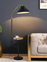 Ozz Floor Lamp combines lighting and functionality in a sleek, modern design. Featuring a slender metal frame with a pleated shade, it extends into a compact wooden side shelf—perfect for holding a phone, book, or small plant. Anchored by a solid marble base, this lamp brings together form and function, adding both ambient light and a touch of style to your living space. Ideal beside a sofa or tucked into a cozy corner, it enhances your home with warmth, utility, and refined charm.